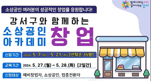 (서울=NSP통신) 강은태 기자 = 서울시 강서구(구청장 진교훈)가 오는 27일과 28일 이틀간 진행하는 ‘소상공인 창업아카데미’에 참여할 수강생을 모집한다.
