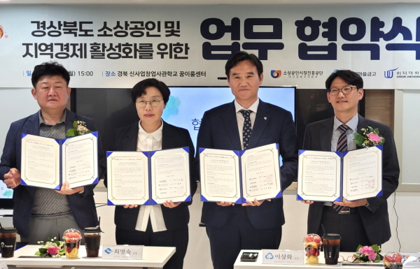협약식은 최영숙 경상북도 경제산업국장, 전상진 소상공인진흥공단 대구지역본부장, 이상화 새마을금고중앙회 경북지역이사, 이성환 위덕대학교 산학협력단장이 참석했다.