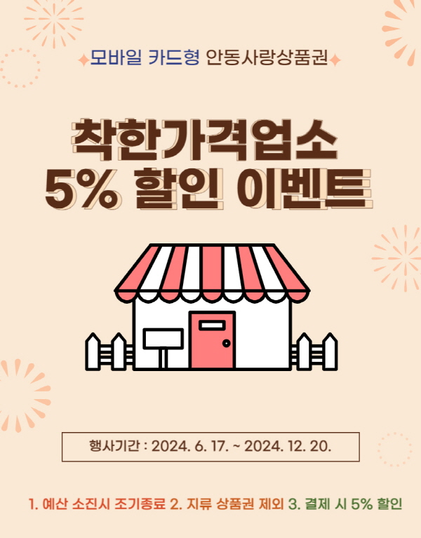 시는 고공행진 중인 물가로 어려움을 겪고 있는 시민과 소상공인을 위해 착한가격업소에서 모바일·카드형 안동사랑상품권으로 결제 시 결제금액의 5%를 지원해 구매자는 모바일 안동사랑상품권 충전 시 10% 할인과 더불어 5% 할인을 받아 총 15%의 할인 효과를 받을 수 있다.