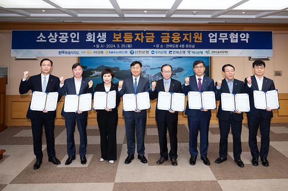 (전북=NSP통신) 서희경 기자 = JB금융그룹 전북은행(은행장 백종일)이 25일 전북도 내 소상공인들을 위해 전북특별자치도 및 전북신용보증재단과 소상공인 회생 보듬자금 금융지원 협약식을 전북도청에서 개최했다고 밝혔다.