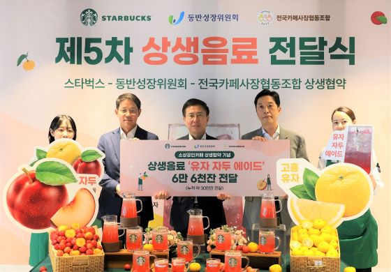 28일 스타벅스는 명동에 위치한 스타벅스 지원센터에서 5차 상생음료 전달식을 진행했다고 밝혔다. 이날 스타벅스는 지난 2022년 3월부터 진행한 1~4차 상생음료 지원 경과도 보고했다.