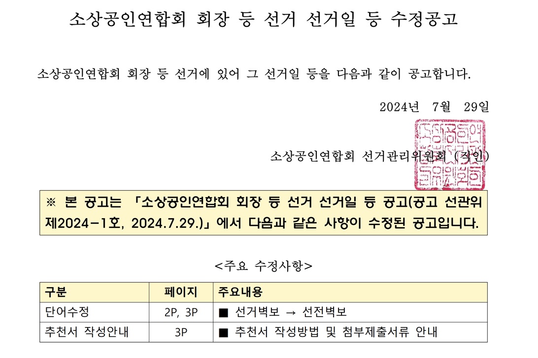 (서울=NSP통신) 강은태 기자 = 소상공인연합회(회장 직무대행 유기준, 이하 소공연)가 지난 29일 제5대 소상공인연합회 중앙회장 선거 일정을 수정 공고했다.