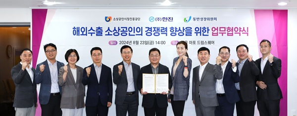 한진은 지난 23일 소상공인시장진흥공단(이하 ‘소진공’) 및 동반성장위원회(이하 ‘동반위’)와 함께 소상공인의 해외 진출과 경쟁력 강화를 위한 업무협약(MOU)을 체결했다.