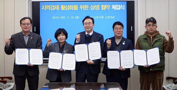 나주시(시장 윤병태)는 지난 24일 나주시의회(의장 이재남), 한국외식업중앙회·대한미용사회 나주시지부, 공공배달앱 먹깨비 대표 관계자와 ‘지역경제 활성화를 위한 상생 협약식’을 가졌다고 25일 밝혔다.