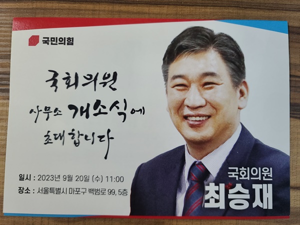 최 의원은 개소식 초대장에 언행일치를 강조했다. 이를 위해 최 의원은 언행일치로 문장으로 만들어 약속했다. 최 의원은 “‘언’제나 행복한 마포를 위해 ‘행’동으로 실천하는 ‘일’하는 국회의원 최승재가 ‘치’열하게 뛰겠다”고 말했다.