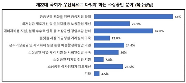 응답자 중 64%(복수 응답)가 이를 꼽았다. 이어서 ‘에너지비용 지원, 결제 수수료 인하 등 소상공인 경영 부담 완화’ 47.8%, ‘최저임금 제도개선 및 인력지원 등 노동환경 개선’ 29.1%, 온누리상품권 및 지역화폐 등을 통한 매출활성화방안 마련 24.4%, 소상공인 상가임대차 제도개선 23.5% 등의 순이었다.