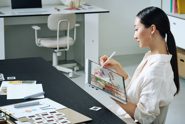 한층 슬림해진 전용 스타일러스 펜은 응답 속도를 높여 필기감을 높였고, 본체에 자석으로 부착해 무선 충전도 가능하다.