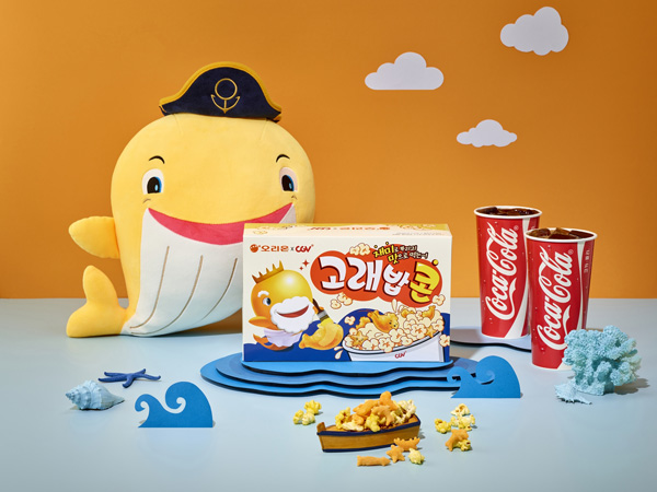 달콤치즈맛 고래밥이 CGV의 고소팝콘, 달콤팝콘, 어니언팝콘, 치즈팝콘 모두와 궁합을 이뤄 어떤 팝콘 맛을 선택해도 맛있게 즐길 수 있다.