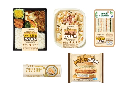이번 신제품은 총 5종이며 국내산 감자 44톤으로 도시락, 햄버거, 조리면, 김밥, 샌드위치 등의 간편식 시리즈로 만들었다.