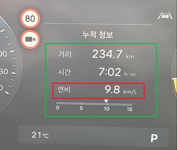 총 234.7km를 7시간 2분 동안 시승한 후 체크 한 현대차 그랜저 3.5 모델의 실제 주행 연비는 총 9.8km/ℓ를 기록했다.