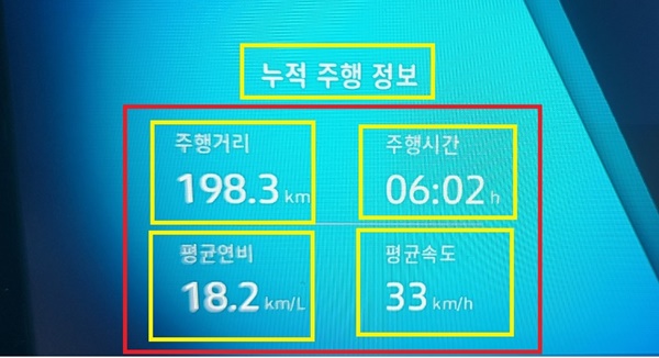 6시간 2분 동안 평균속도 33km/h 주행 후 실제 주행 복합연비 18.2km/L 기록