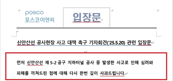 (서울=NSP통신) 강은태 기자 = 포스코이앤씨가 신안산선 공사 현장 붕괴사고와 관련해 사과 입장문을 발표했다.