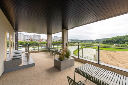 1층은 둥근 모양의 대형 조명을 설치하고, 부드러운 곡선 형태의 좌석과 테이블로 구성해 전체적으로 안정감 있고 편안하게 꾸몄다. 매장 2층은 서로 다른 매력을 즐길 수 있는 공간을 마련했다. 2층에 올라서면 제일 먼저 박공 지붕(책을 엎어놓은 모양의 지붕 형식) 모양의 천정과 통 유리창이 한 눈에 담긴다. 높은 천고와 유리창을 통해 들어오는 자연광으로 시원한 개방감을 느낄 수 있다. 가벽으로 분리한 공간에는 레드 천정과 야외용 테이블을 설치해 야외 카페 분위기를 연출했다. 2층에 연결된 야외 테라스에서는 넓게 트인 논뷰를 바라 볼 수 있어, ‘풀멍’, ‘식물멍’을 즐기며 휴식하기 좋다.