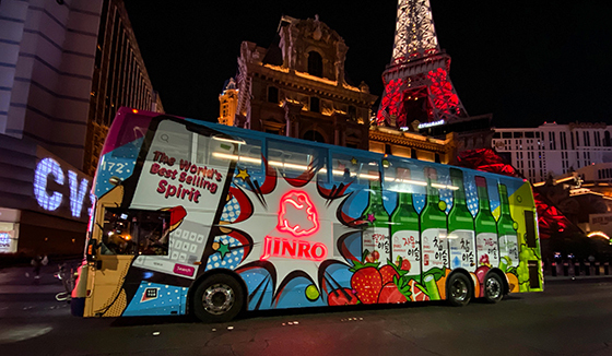 랩핑버스는 참이슬과 자몽에이슬, 자두에이슬 등의 주요 제품과 함께 알록달록한 과일들이 만화형식으로 디자인돼 멀리서도 진로 소주가 한눈에 부각된다. 특히 라스베이거스 특유의 화려한 거리 풍경과 어울리는 일루미네이션을 활용해 세계에서 가장 많이 팔린 증류주 ‘진로’와 상징인 ‘두꺼비’를 알리는데 중점을 두었다.