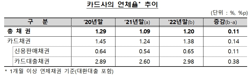 이와 함께 지난해말 기준 카드사 연체율(총채권)은 1.20%로 전년말 대비 0.11%p 상승했다. 카드채권 연체율은 1.38%로 전년말 대비 0.14%p 상승했고 그중 카드대출채권 연체율은 2.98%로 전년말 대비 0.38%p 상승했다.
