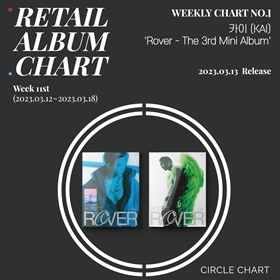 써클차트가 20일 공개한 2023년 11주차(03.12~18) 리테일 앨범차트에 따르면 카이는 지난 13일 발매한 세 번째 미니앨범 ‘Rover’(로버)로 집계 기준이 되는 한 주 동안 가장 많은 판매량인 12만2020장을 기록해 1위에 랭크됐다.