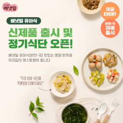 신메뉴 출시 기념 이벤트도 마련된다. 오는 31일까지 유아식 정기식단 주문 고객은 추첨을 통해 데일리라이크 봉봉 옥수수 식기 세트(5명), 데일리라이크 봉봉 실리콘 스푼&포크(5명), 배냇밀 아이 간식박스(10명), 배냇밀 유아식 정기식단 10% 할인 쿠폰(10명)을 받을 수 있다.