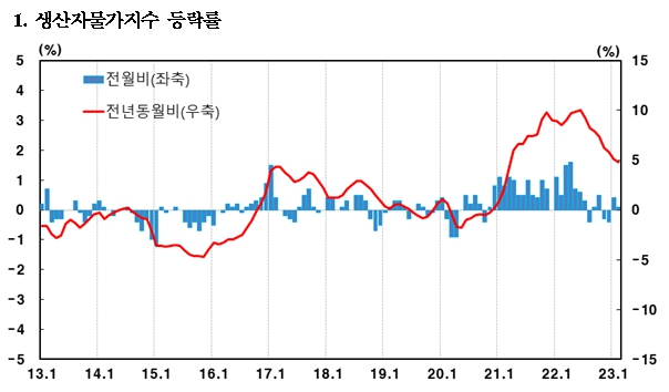 21일 한국은행이 발표한 ‘2023년 2월 생산자물가지수’에 따르면 2월 생산자물가지수는 120.42(2015년 100기준)로 전월대비 0.1% 상승했다. 2개월 연속 상승이다.