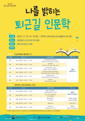 (전남=NSP통신) 김성철 기자 = 광양용강도서관은 오는 4월 6일부터 ‘나를 밝히는 퇴근길 인문학’이라는 주제로 문화체육관광부 공모사업인 ‘2023 도서관 길 위의 인문학’ 프로그램을 운영한다고 밝혔다.