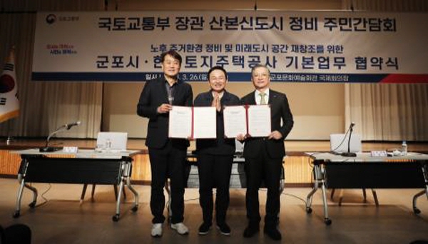 (서울=NSP통신) 정의윤 기자 = 한국토지주택공사(LH)는 지난 26일 군포시와 노후 주거환경 정비 및 지속가능한 미래도시 공간 재창조를 위한 기본업무 협약을 체결했다고 27일 밝혔다.