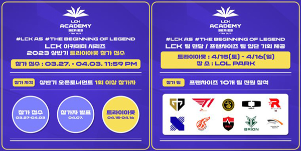 이번 트라이아웃은 4월 15일, 16일 양일간 LoL파크(서울 종로)에서 진행되며, 참가자들은 LCK 팀 관계자들이 지켜보는 가운데 스크림 및 솔로랭크에 임한다.