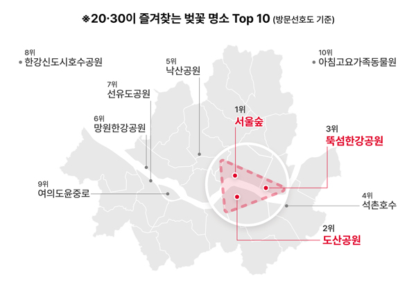 (서울=NSP통신) 이복현 기자 = SK텔레콤(대표 유영상)이 2030 청년들은 벚꽃 시즌에 ‘서도뚝’ 삼각벨트(서울숲-도산공원-뚝섬유원지)를 많이 찾은 것으로 조사됐다고 밝혔다.