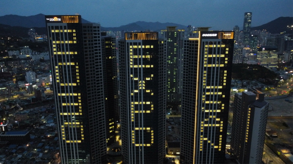 두산건설은 국제박람회기구 실사단이 부산을 방문하는 지난 4일부터 7일까지 총 4일간 부산 동구 범일동에 위치한 두산위브더제니스 하버시티 현장의 101동, 106동, 107동 가구 내부 전등을 활용해 엑스포 유치를 응원하는 이벤트를 기획했다.