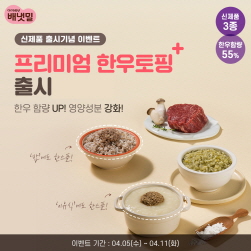 배냇밀몰 내 이벤트 페이지에 한우토핑 퀴즈를 풀고 정답을 댓글로 남기면, 추첨을 통해 10명은 한우토핑 체험기회를 얻는다. 오는 12일 오전 10시에는 타임세일을 통해 한우토핑을 보다 저렴한 가격에 구매할 수도 있다.