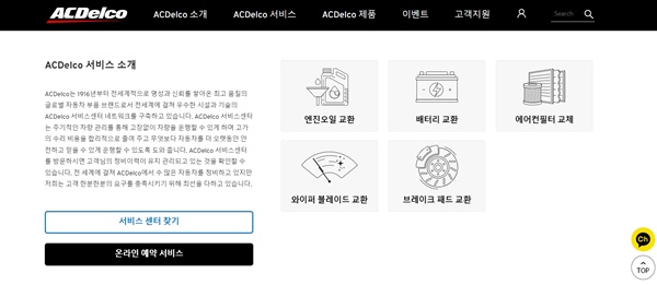 운영시간은 주말과 공휴일을 제외하고 매일 오전 9시부터 오후 6시(점심시간 오후 12시 ~ 1시 제외) 까지다. 또한 에이씨델코(ACDelco) 홈페이지에서도 정비예약이 가능하며 부품 찾기를 통해 본인 차량에 맞는 부품을 검색하고 판매점 위치와 서비스센터 정보 등을 얻을 수 있다.