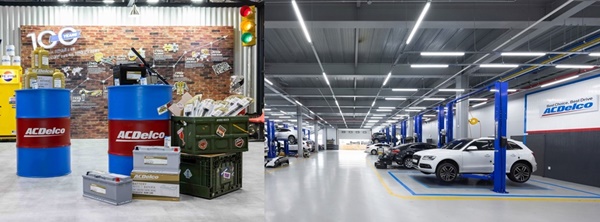 프리미엄 엔진오일(가솔린, 디젤), MF 배터리, AGM 배터리, 브레이크 패드, 와이퍼 블레이드(좌)와 에이씨델코(ACDelco) 평촌 서비스센터 내부(좌)