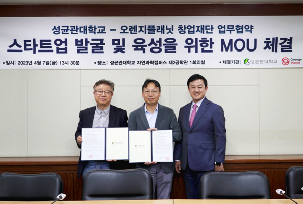 오렌지플래닛과 성균관대학교는 지난 7일 성균관대학교 자연과학캠퍼스 제2공학관 1회의실에서 ‘스타트업 발굴 및 육성‘에 관한 업무협약을 체결했다.
