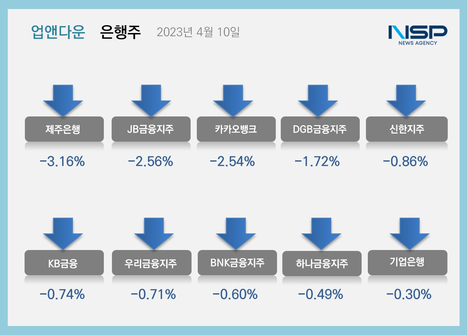 (서울=NSP통신) 강수인 기자 = 10일 코스피(+0.88%)와 코스닥(+1.09%)은 모두 상승한 가운데 은행주는 전거래일 대비-1.01% 하락했다. 은행주는 11종목 모두 하락했다.