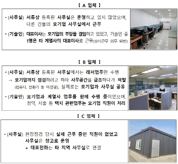 국토부에 따르면 2차 현장점검 결과 적발된 업체들은 지난 202년 서류점검 및 대책 발표에도 불구하고 등록기준을 미달한 상태로 운영하던 업체들이다라고 설명했다. 주요 적발사항은 ▲사무실 미운영 ▲기술인 수 미달 등이다.