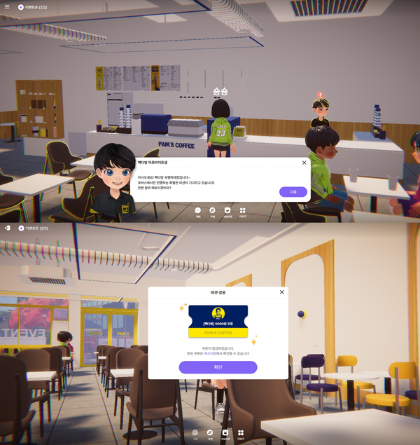 이벤트 존에 진입하면 빽다방 매장에서 홍보영상을 시청하거나 한신포차 매장에서 가상 키오스크로 음식을 주문하며 브랜드를 체험할 수 있다.