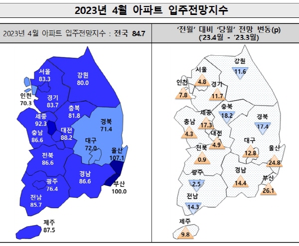 주산연에 따르면 정부의 주택시장 연착륙 대책과 봄 이사철 기대심리 영향으로 부산(73.9→100), 울산(82.3→107.1), 세종(75.0→92.3), 대구(59.2→72.0), 경남(72.2→86.6) 5개 시·도에서 입주전망이 10p 이상 개선됐다고 설명했다.