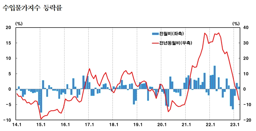 13일 한국은행이 발표한 ‘2023년 3월 수출입물가지수’에 따르면 2023년 3월 수입물가(원화기준)는 국제유가가 하락했으나 원·달러 환율 상승의 영향으로 화학제품, 제1차 금속제품 등이 오르면서 전월대비 0.8%P 상승했다. 전년 동월 대비로는 6.9% 하락이다.