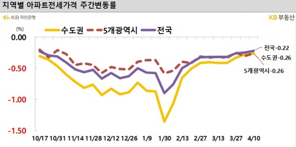 KB부동산은 지난 10일 발표한 ‘주간KB주택시장동향’ 자료에 따르면 전국 아파트 전세가는 -0.22%로 하락폭이 조금씩 감소하고 있다고 밝혔다.