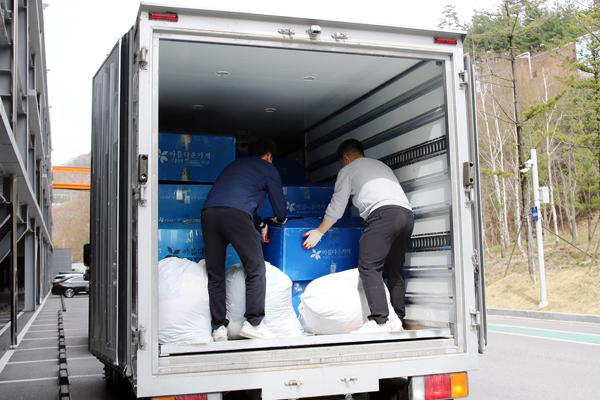 지난 13일 강원랜드 봉사단은 정선경찰서에서 1차로 선별작업을 마친 폐기대상 유실물 4467점 중 재활용 할 수 있는 의류, 휴대폰 충전기 등을 추려 아름다운가게에 전달했다.