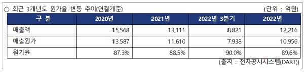 (서울=NSP통신) 강은태 기자 = 금융감독원(이하 금감원) 전자공시에 따르면 한신공영(004960)의 2022년 연결기준 원가율이 전년 대비 1.1% 상승에 불과한 89.6%를 기록하며 원가율 방어에 성공한 것으로 나타났다.