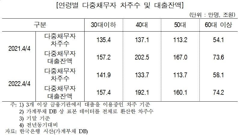 60대 이상 다중채무자는 4만명 늘어난 58만 1000명이며 대출잔액 또한 6000억원 증가한 74조 2000억원으로 나타났다.