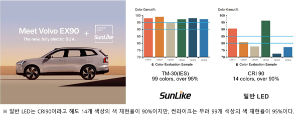 썬라이크는 볼보 EX90의 실내조명 전체에 적용됐으며, 색상과 질감표현이 중요한 이탈리아 폼페이 유적지 벽화 등 세계적인 대형 박물관과 미술관에도 이미 채택된 바 있다.