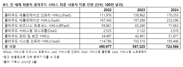 2023년에는 클라우드 시장의 모든 부문이 성장할 것으로 예상된다. 서비스형 인프라(IaaS)가 30.9%로 가장 높은 최종 사용자 지출 증가율을 보일 것으로 예상되며, 서비스형 플랫폼(PaaS)이 24.1%로 그 뒤를 이을 것으로 보인다.