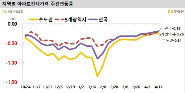 KB부동산은 지난 17일 발표한 ‘주간KB주택시장동향’ 자료에 따르면 전국 아파트 전세가는 -0.17% 하락했다고 밝혔다.