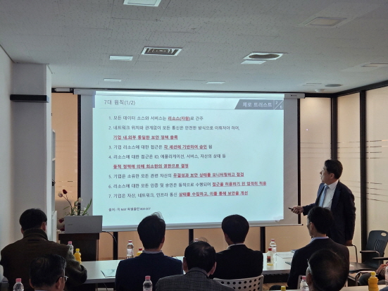 마지막으로 이 사장은 제로 트러스트의 7대 원칙으로 모든 데이터 소스와 서비스는 리소스(자원)로 간주, 네트워크 위치와 관계없이 모든 통신은 안전한 방식으로 이뤄져야 한다고 강조했다.