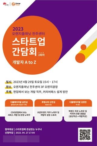 (서울=NSP통신) 이복현 기자 = 오렌지플래닛 창업재단(센터장 서상봉, 이하 오렌지플래닛)이 4월 29일 전주센터에서 ‘개발자 A to Z’를 주제로 2023년 스타트업 간담회 2회차를 개최한다.