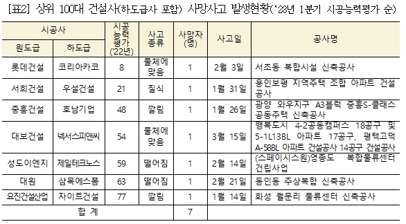 국토교통부(장관 원희룡)는 2023년 1분기 중 건설사고 사망자가 발생한 시공능력평가 상위 100대 건설사와 사고 책임이 있는 관련 하도급사, 공공발주 공사의 발주청, 인·허가기관(지자체) 명단을 공개했다.