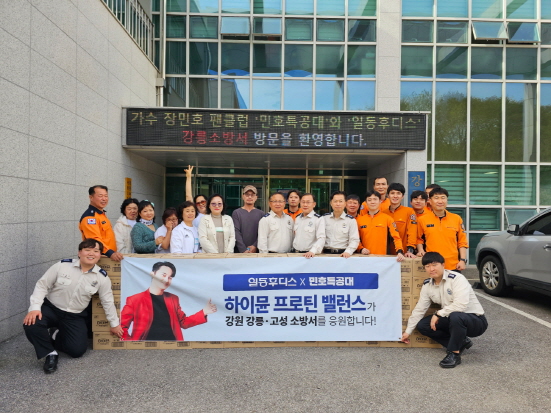 지난 20일 일동후디스와 장민호 팬카페 ‘민호특공대(7번 국도 노래비 팀)’은 강원도 강릉소방서를 방문, 3000만원 상당의 하이뮨 제품을 전달했다. 이는 최근 강릉을 비롯, 산불로 큰 피해를 입은 동해안 일대의 화재 진압에 나섰던 소방관들께 감사한 마음을 담았다.