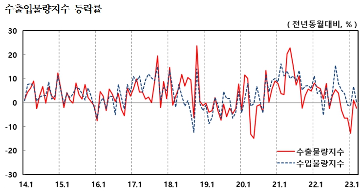 26일 한국은행이 공개한 ‘2023년 3월 무역지수 및 교역조건’에 따르면 3월 수출물량지수는 운송장비, 석탄 및 석유제품 등이 하락했으나 컴퓨터·전자 및 광학기기가 전년 동월 대비 15.7% 감소하면서 전년 동월 대비 2.4% 하락했다.