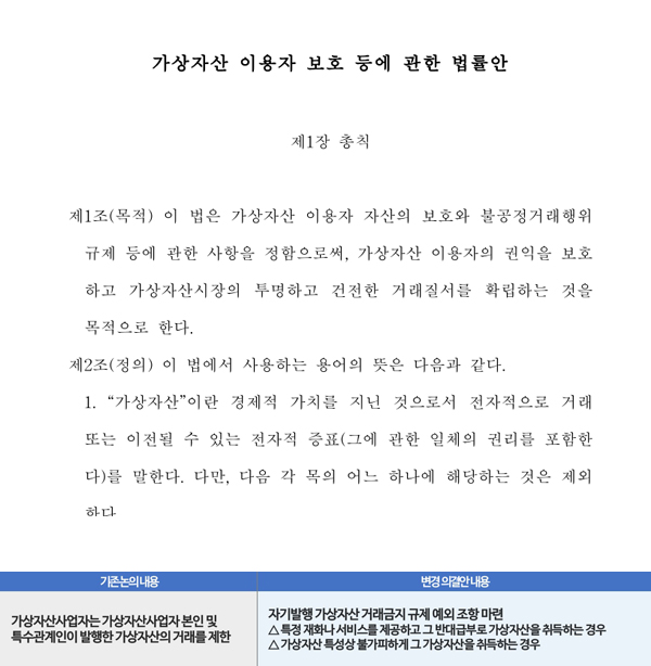 또 가상자산사업자의 가상자산의 경우 거래제한을 원칙으로 뒀다. 단 ▲특정 재화나 서비스를 제공하고, 그 반대급부로 가상자산을 취득하는 경우 ▲가상자산 특성상 불가피하게 그 가상자산을 취득하는 경우 등 두 가지 예외조항이 마련됐다.