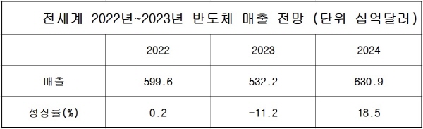 2022년 반도체 시장 규모는 총 5996억 달러로, 2021년 대비 0.2% 소폭 성장한 것으로 드러났다. 하지만 다가오는 반도체 시장의 단기 전망은 더욱 악화돼 2023년 전 세계 매출은 총 5322억 달러에 그칠 것으로 전망했다.